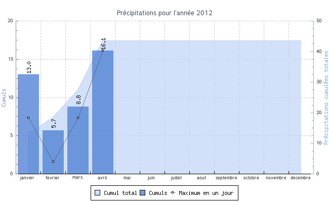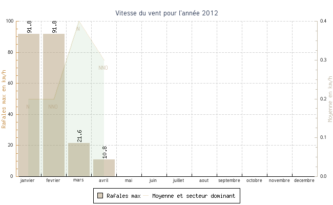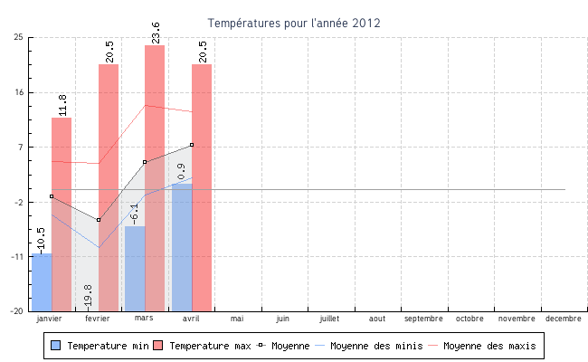 | avril | 0.9 °C | 2.0 °C | 20.5 °C | 12.8 °C | 7.4 °C | 0.3 km/h | 10.8 km/h | NNO |